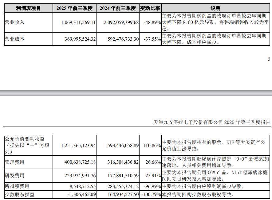 10月24日晚间,曾经的大牛股九安医疗(002432)公布2025年三季报,公司前三季实现营业收入10.69亿元红海优配,同比下降48.89%;归母净利润为15.89亿元,同比上升16.11%;扣非归母净利润为15.78亿元,同比上升14.60%;经营现金流净额为-3407万元,同比下降104.90%。
